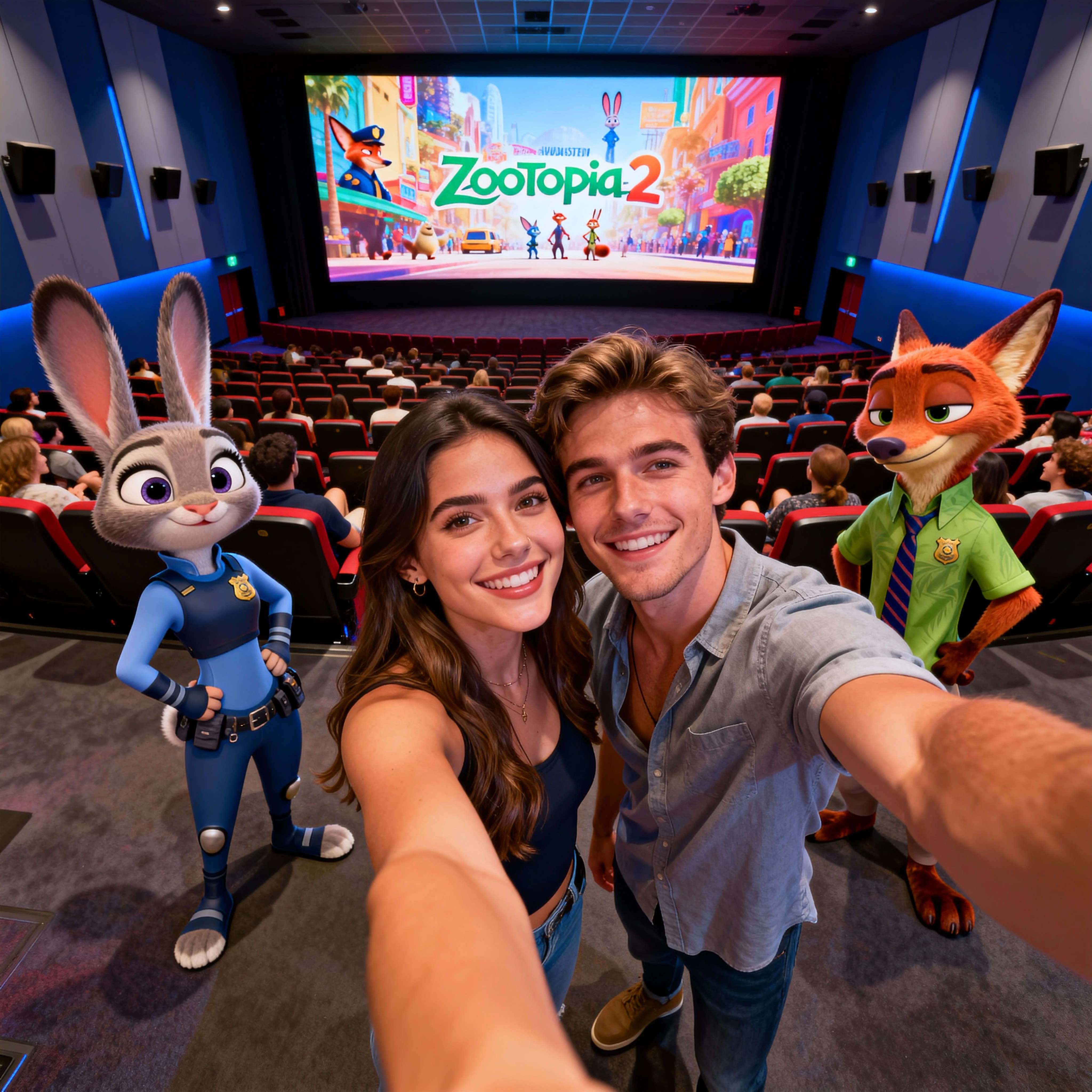 The Zootopia 2 movie poster shines on the big screen behind you, creating that perfect premiere selfie backdrop fans dream about.